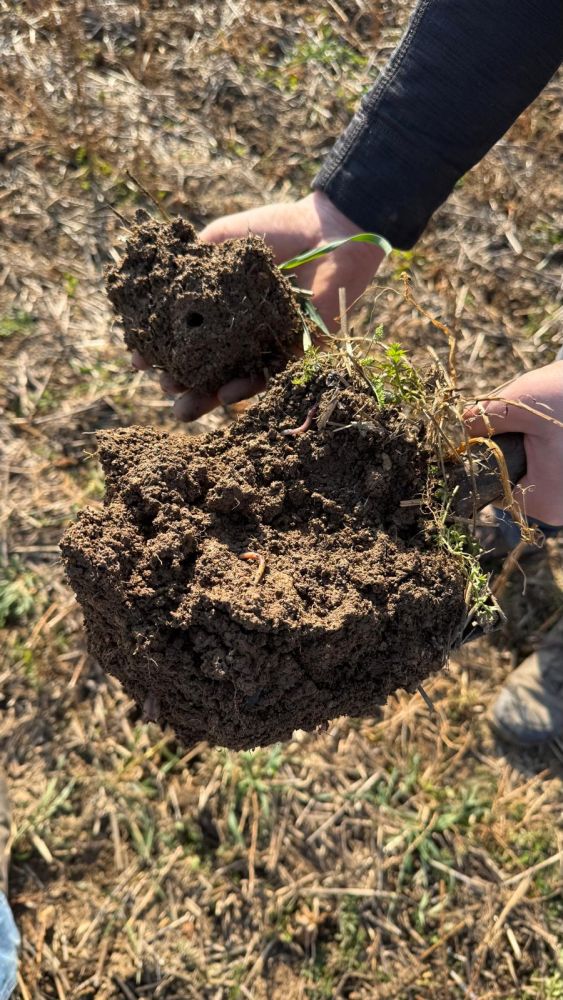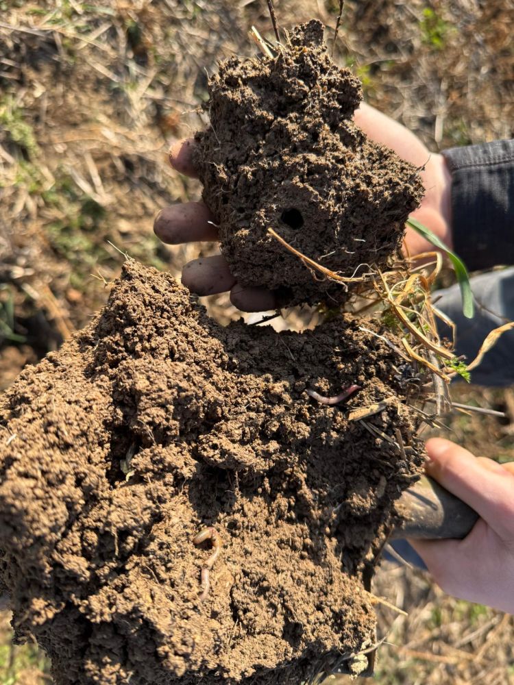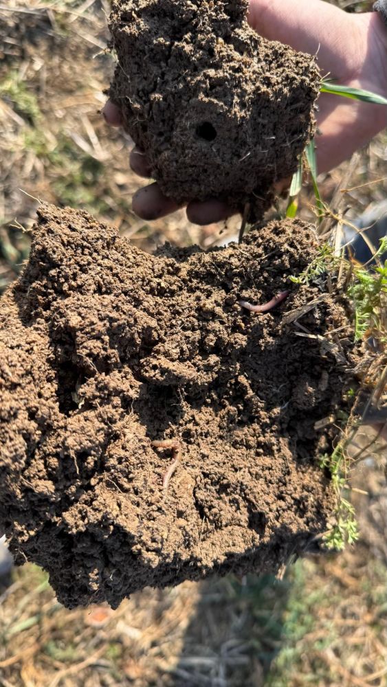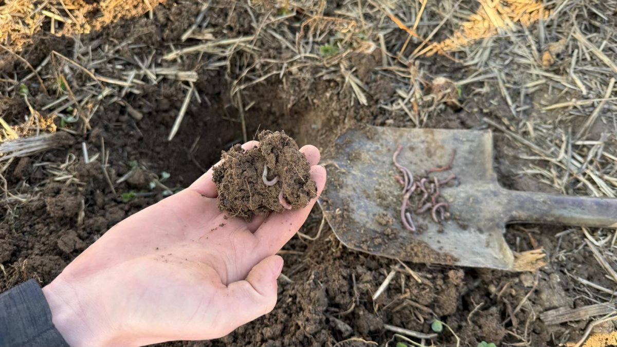 Na naší farmě výsledky vidíme jinak — ne v procentech, ale v tom, jak půda vypadá a chová se. Je tmavá, voní po lese, po dešti vsakuje vodu místo aby se na ní tvořily louže. A při každé rýčové zkoušce z ní vypadávají žížaly desítkami.