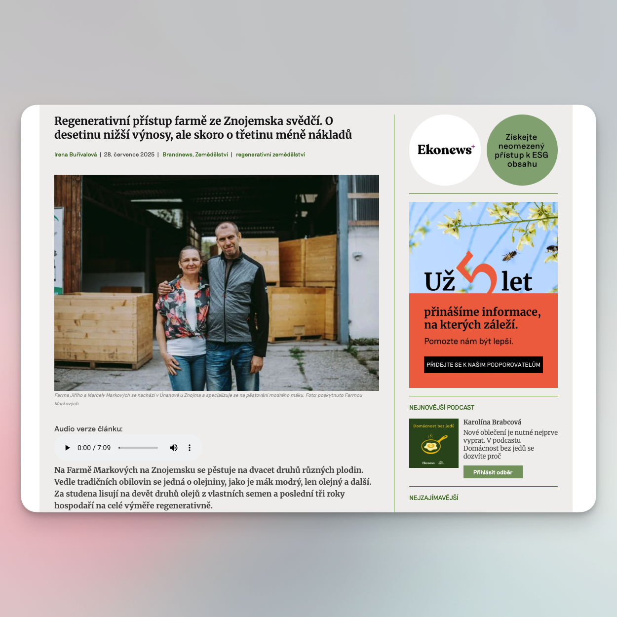 Do 34. dílu podcastu „Sedláci v éteru“ přijali pozvání manželé Marcela a Jiří Markovi, kteří hospodaří v Únanov na Znojemsku. Markovi se na hospodářství s dlouhou tradicí věnují velkému množství různých plodin a chovu menšího stáda ovcí. Své produkty nabízejí jako krmiva, směsi pro exotické ptactvo a také v podobě zpracovaných olejů.Proč se rozhodli zapojit do regenerativního zemědělství? V čem je podle Markových české soukromé zemědělství dál, než zemědělství v Rakousku? A jaké podobnosti jsou mezi prací ve zdravotnictví a v zemědělství?